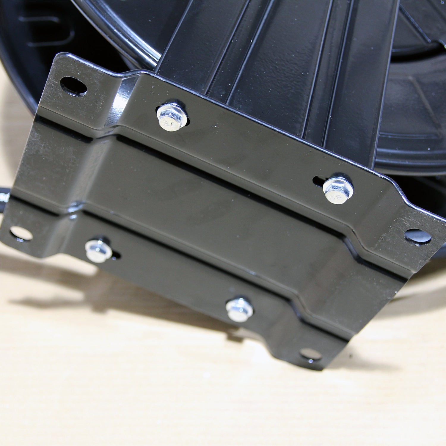 Designed to take a 20m high pressure hose (not included) and features a mounting plate for floor or wall mounting. Has a 14.8mm (3/8") male quick release inlet and a 3/8" male screw thread outlet. Dimensions. Mounting plate: 24cm * 19cm square Drum diameter: 45cm Height: 48cm to Bracket hose outlet