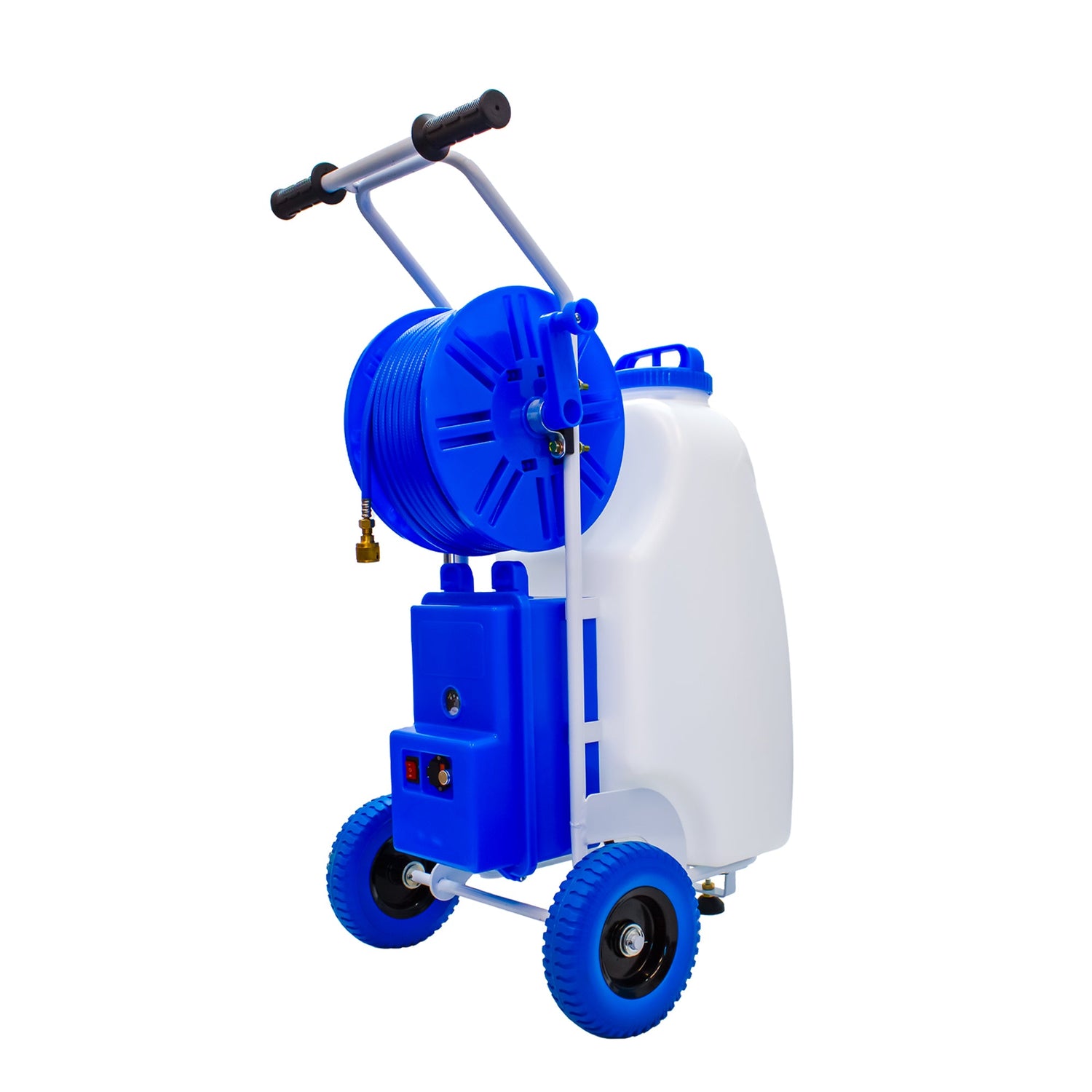 Commercial Trolley — 50 m hose & reel for long runs without moving the unit.