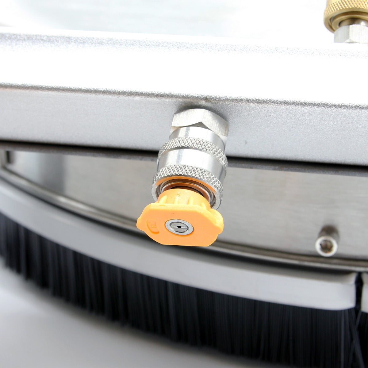 Professional 21" stainless steel surface cleaner with dual trigger, integrated wash broom, and side jets. Built with a double arm spray system for consistent cleaning performance. Perfect for block paving, patios, driveways, and commercial flooring.