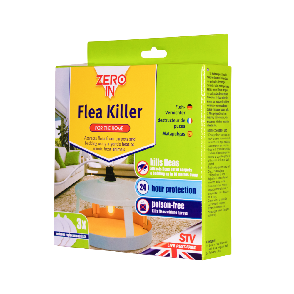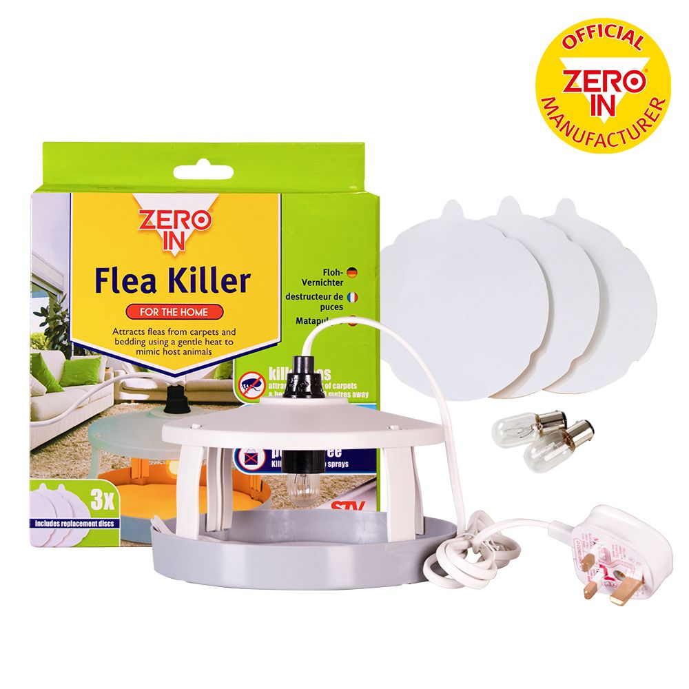 The Zero In® Flea Killer is a highly effective device designed to help eliminate flea infestations in households. The device works by emitting a gentle heat that mimics the body temperature of warm-blooded animals such as cats and dogs, which attracts fleas to the trap from all directions. The device contains an adhesive disc that traps the fleas without the need for any harmful poisons or sprays, making it a safe and effective solution for pet owners.