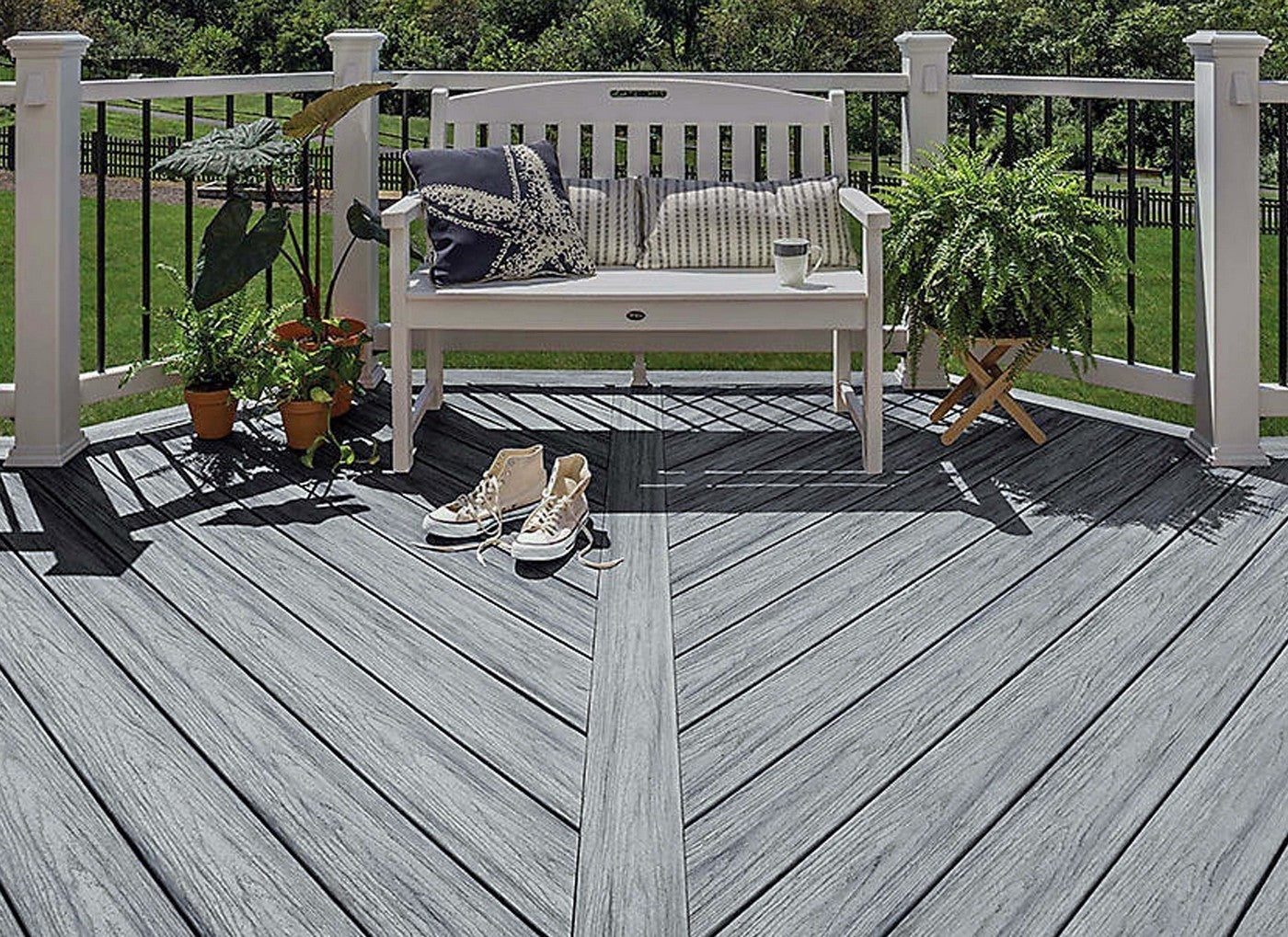 The Trex Transcend Composite Decking is in the sleek 'New Gravel Path' colour, combining a luxurious look with long-lasting durability.