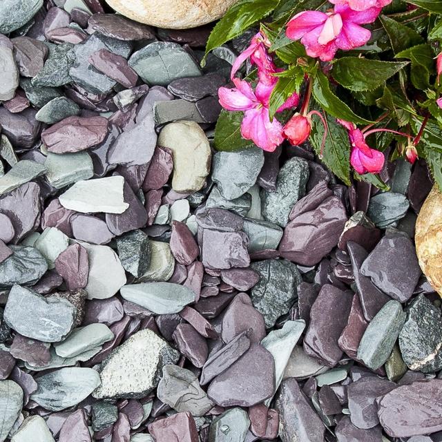 The Water-Worn Welsh Slate Blend is an exquisite choice for those looking to bring a natural, serene look to their gardens. This blend of blue, plum, and green slate, tumbled to perfection, mimics the appearance of pebbles polished by nature itself. Ideal for paths, planting areas, and especially around water bodies, it elevates the garden's aesthetics with its smooth texture and vivid colours. When rinsed, the slate reveals a more decadent blend of colours, making it a must-have for any garden aiming for a standout design. Its flat nature beautifies and ensures practicality, making garden paths comfortable and inviting.